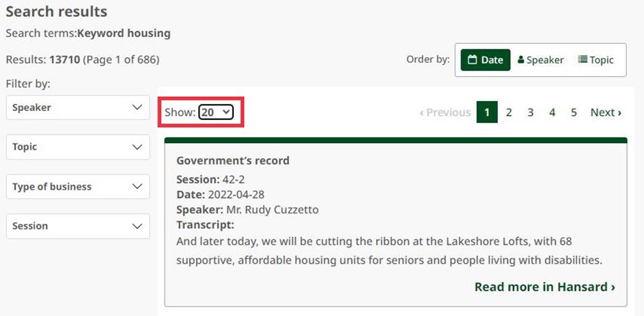 The Hansard search is structured to allow fast and easy access to Hansard transcripts. Results for each day’s Hansard transcript contain the following parts: