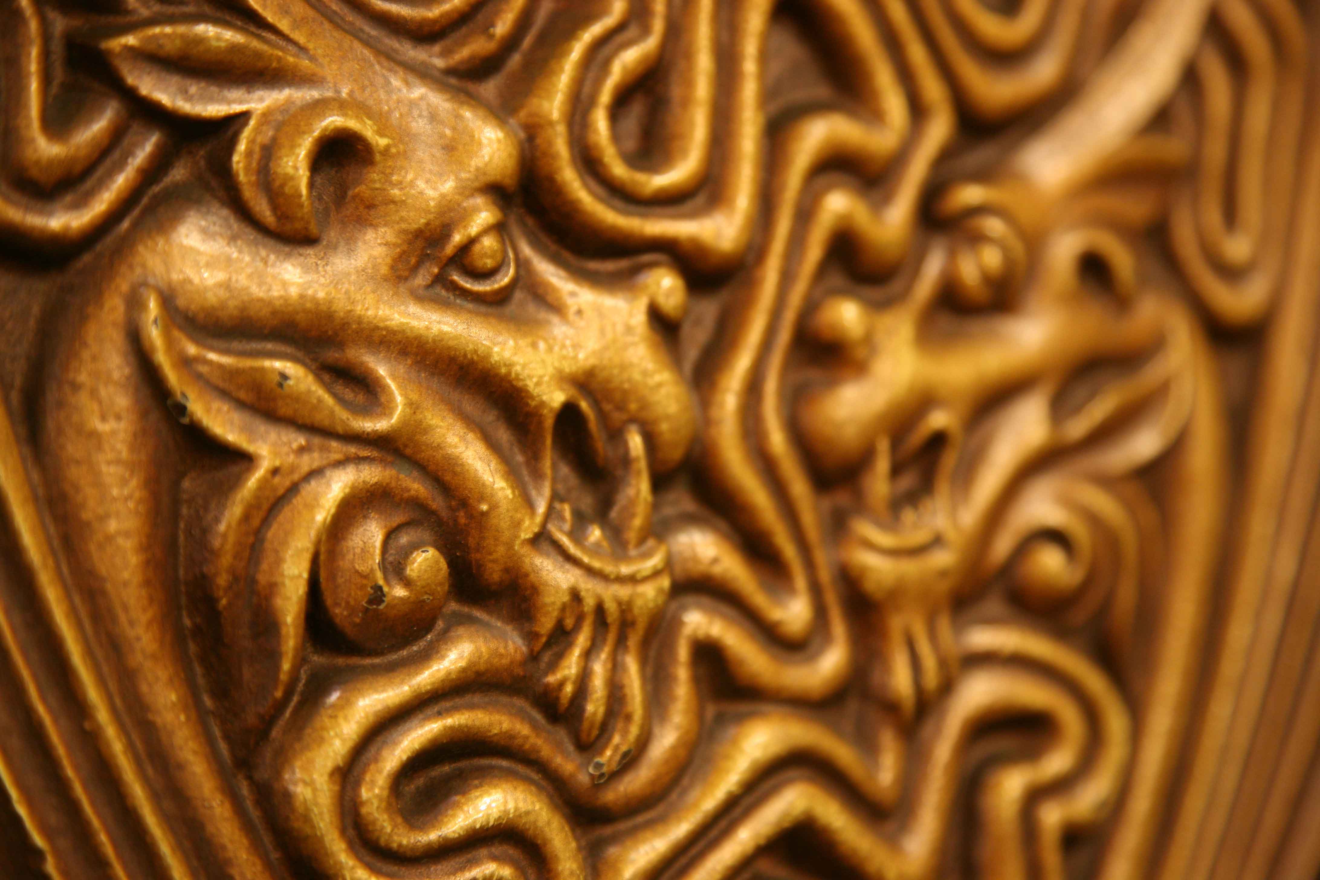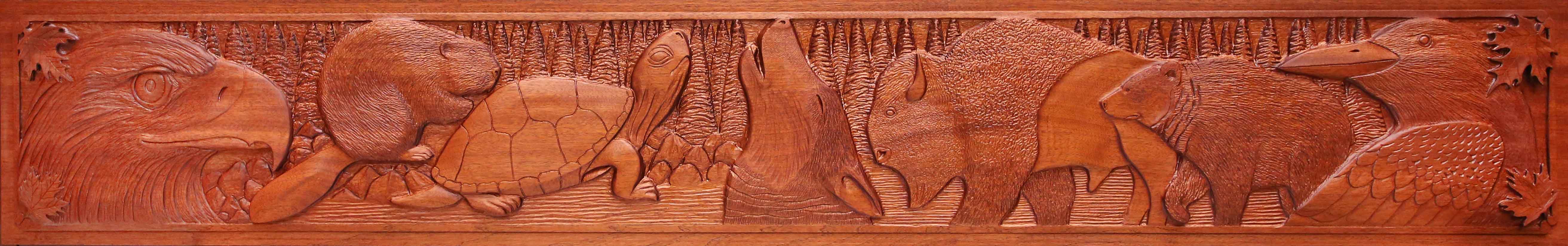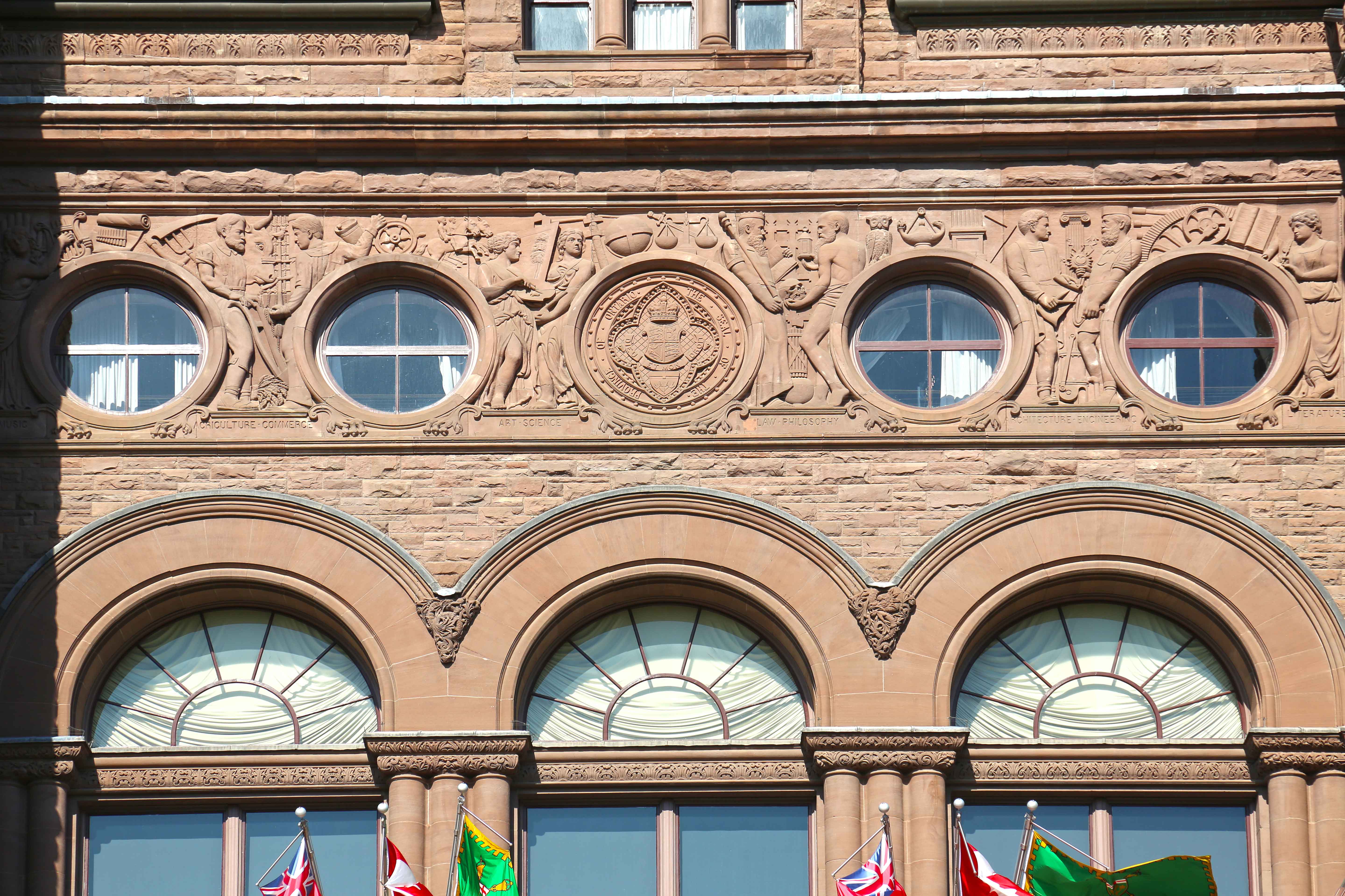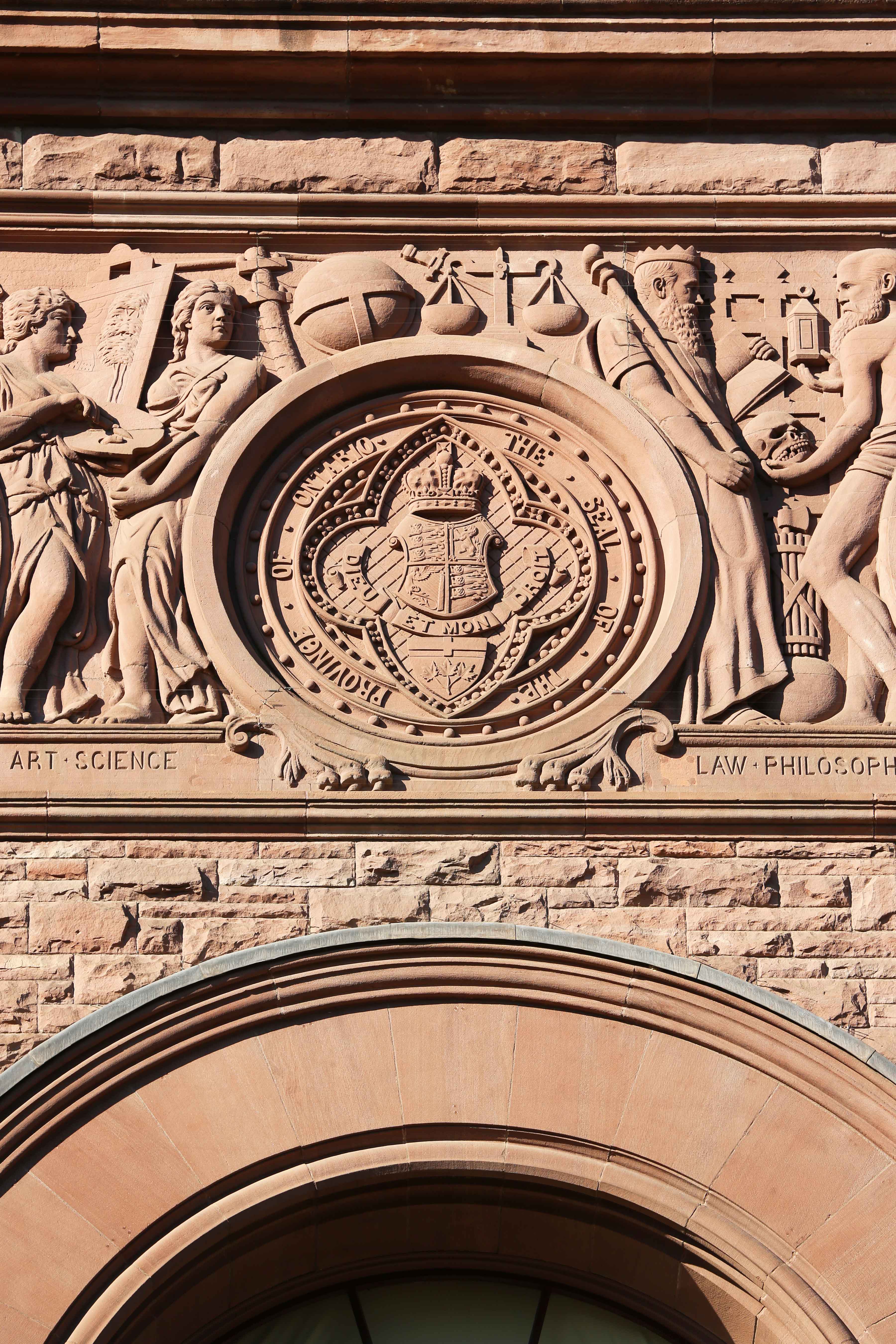 The great seal of Ontario carved in the sandstone of the exterior of the Legislative building