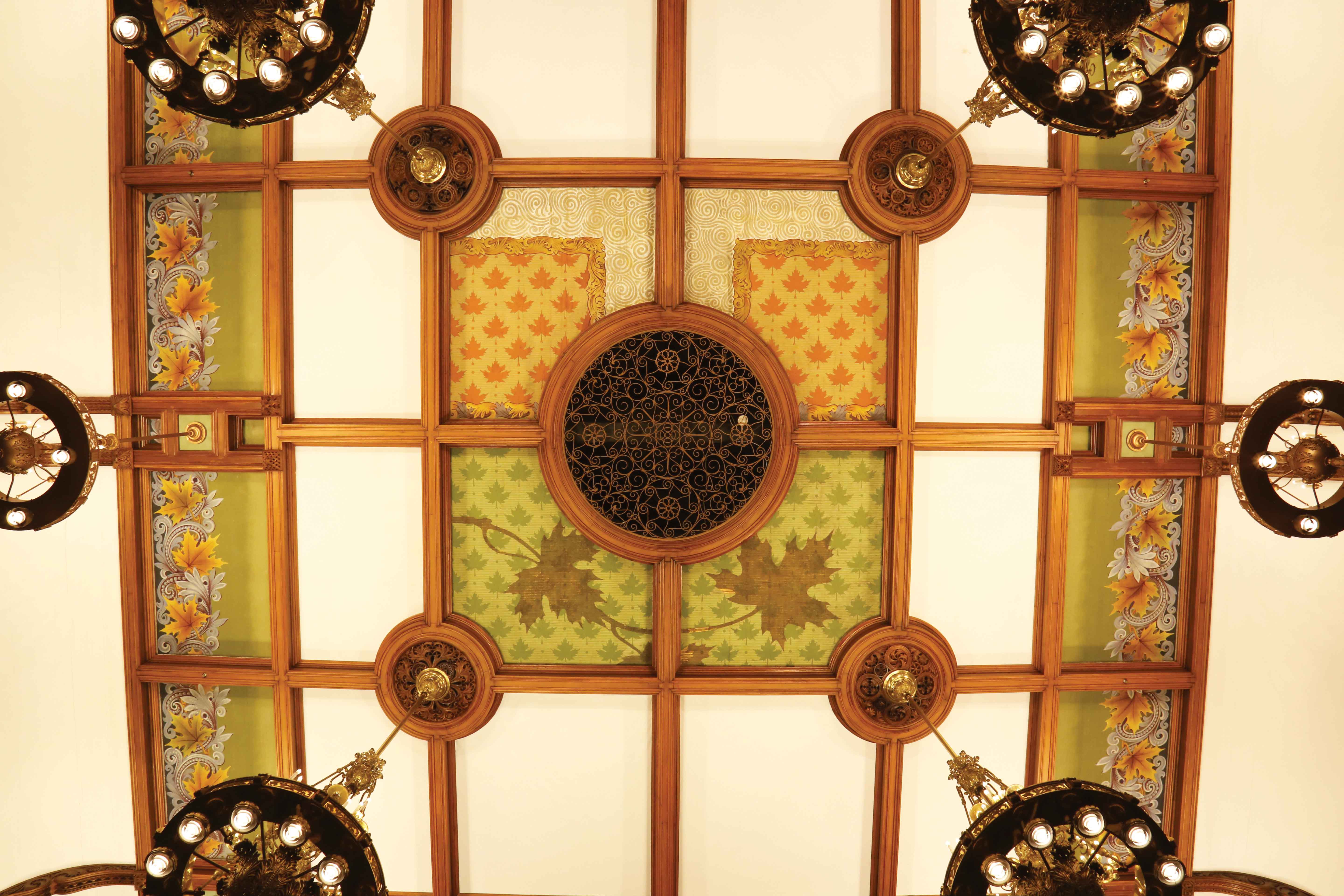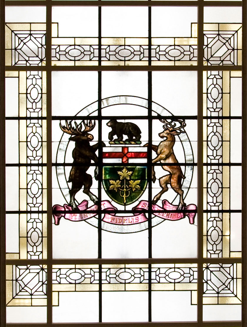 The West wing stained glass ceiling depicting the province of Ontario's coat of arms.