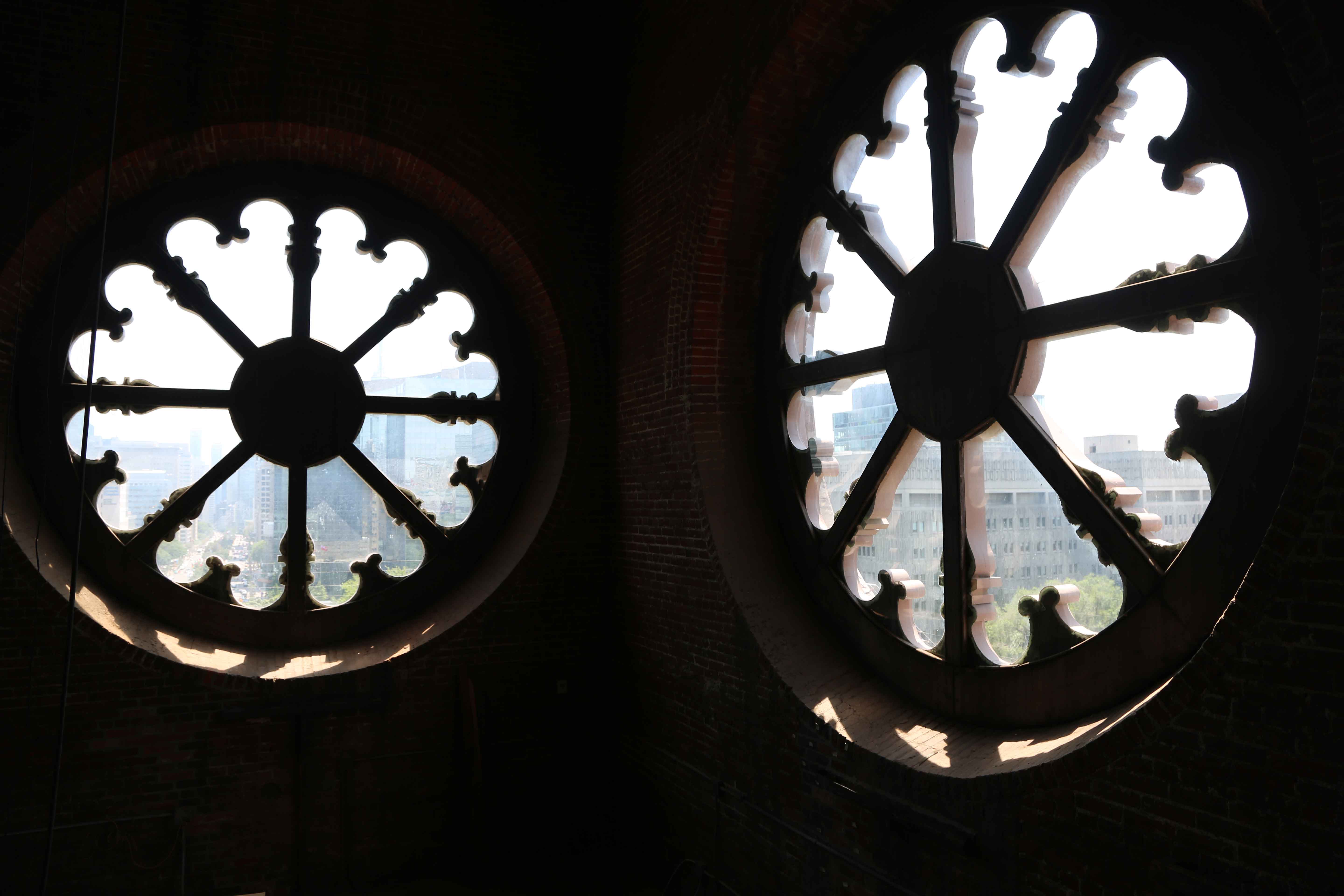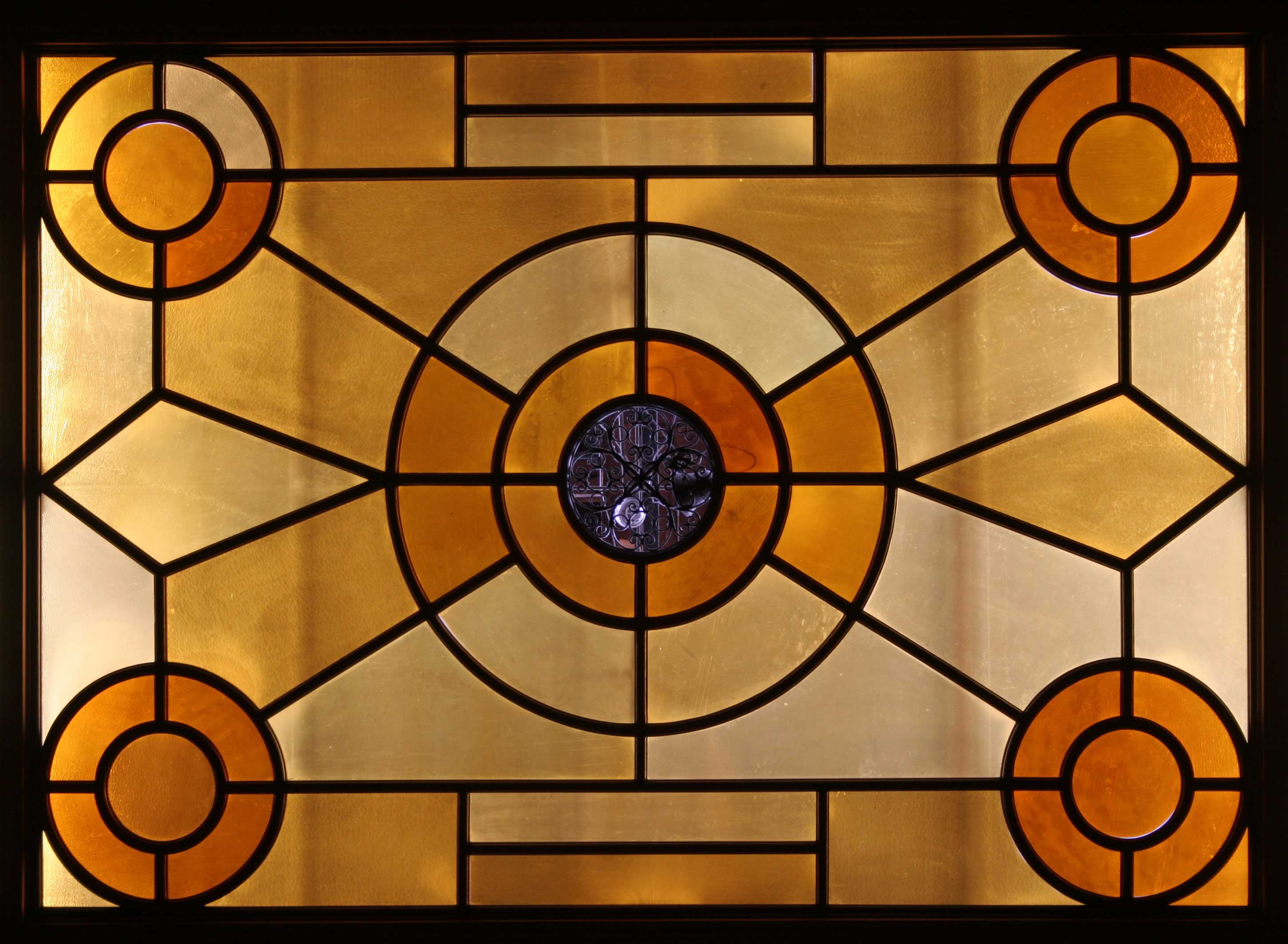 The geometric orange and yellow stained glass ceiling in the East-wing of the Legislative building.