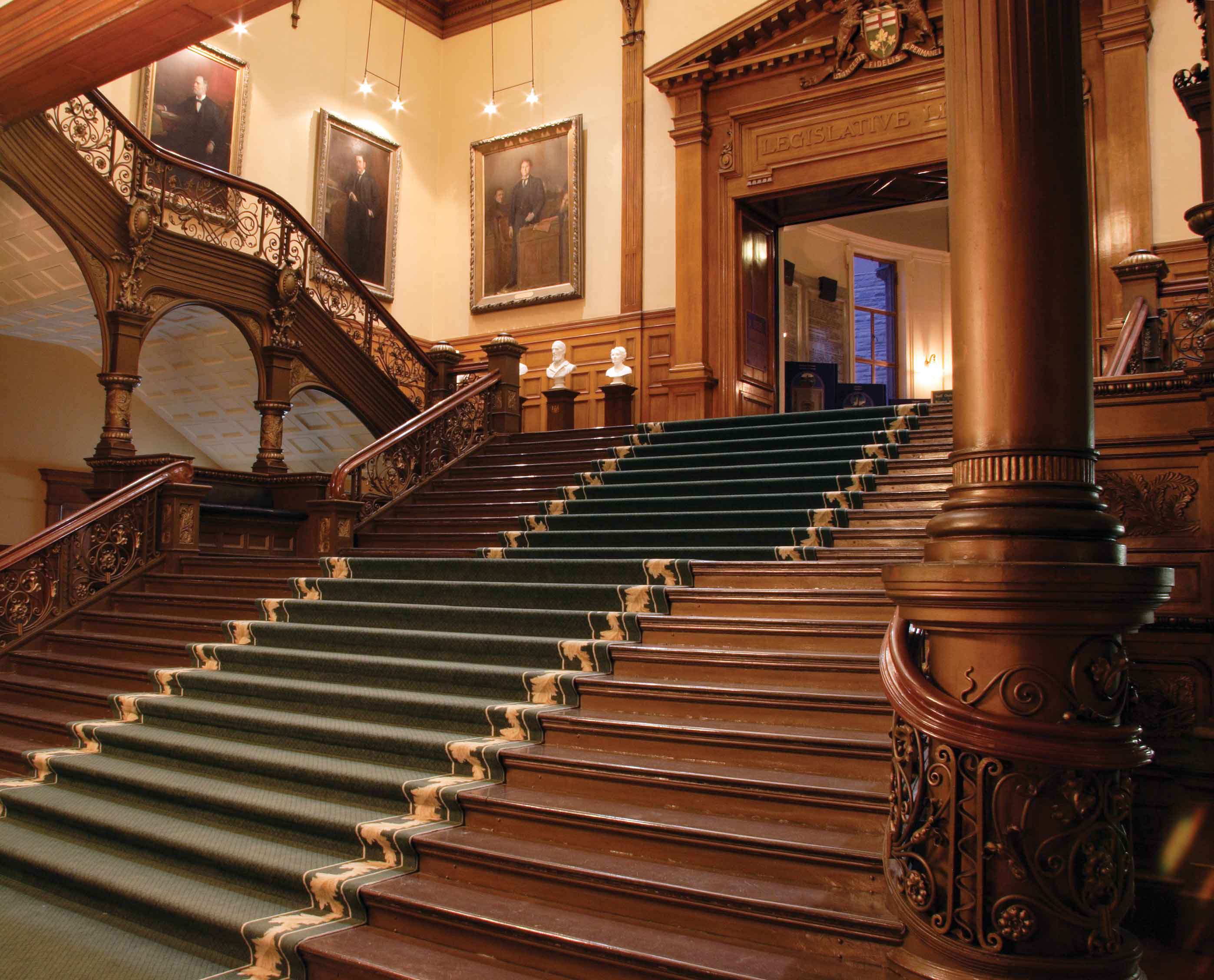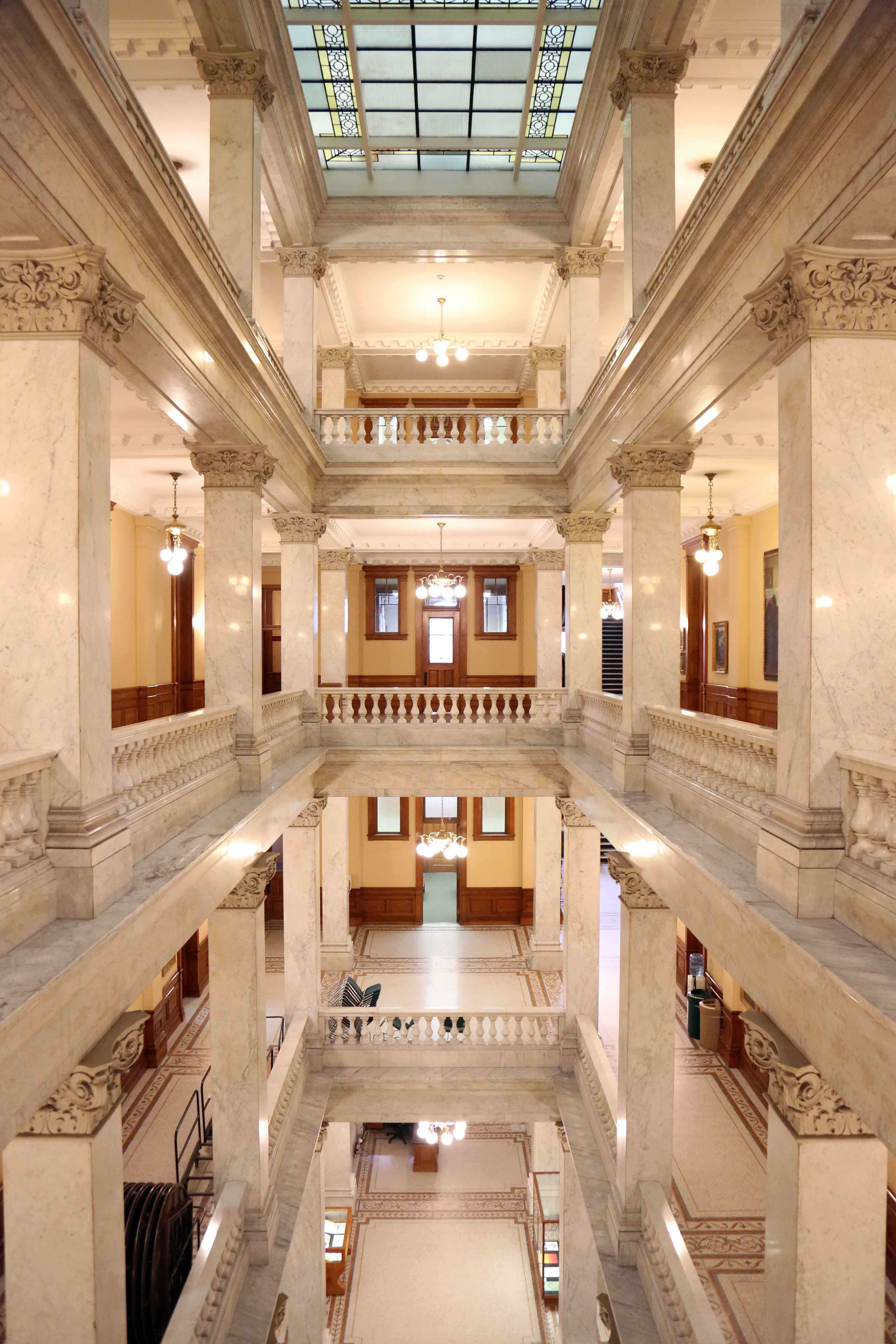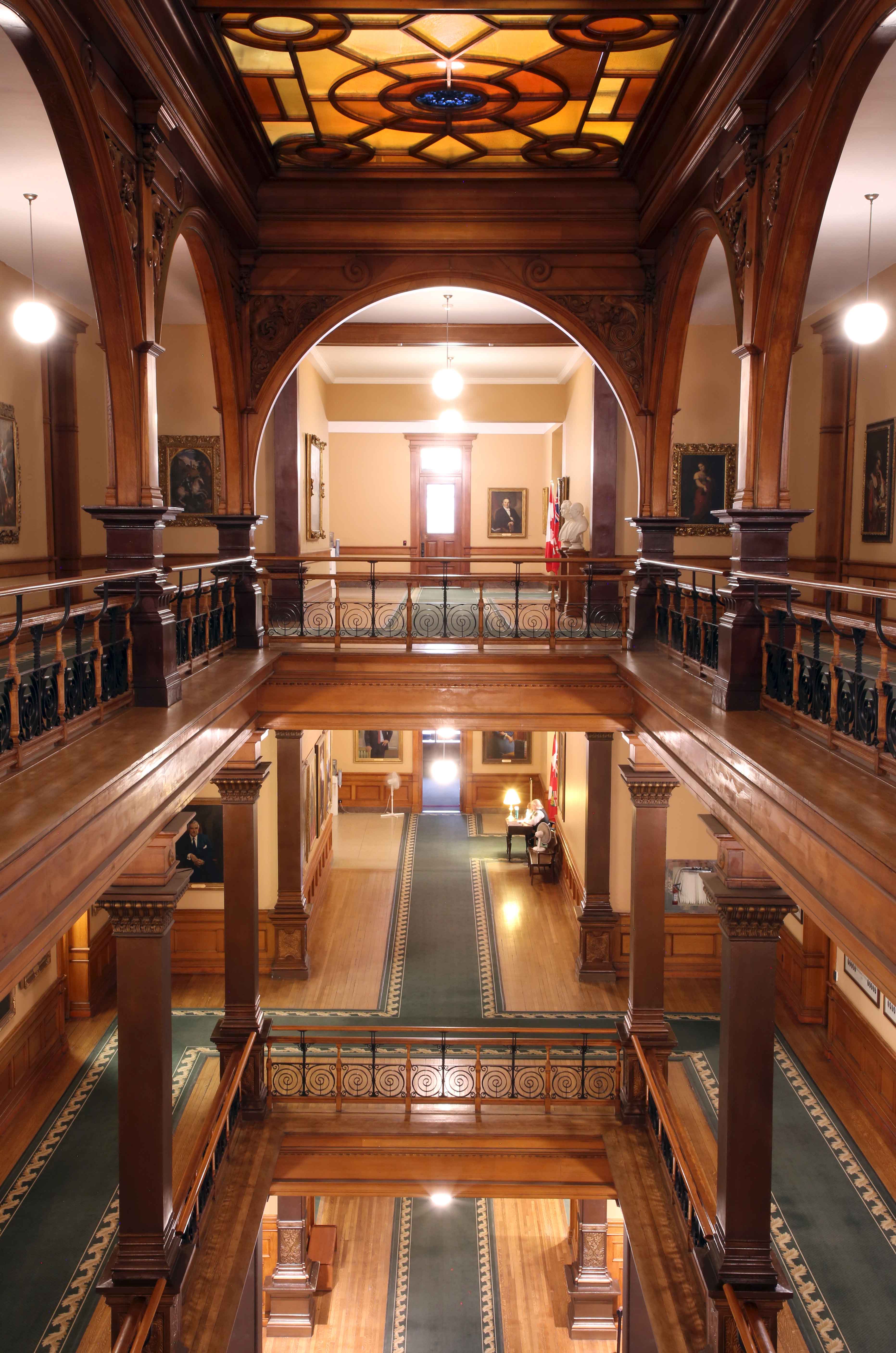 A fulsome view of the three levels of the East wing of the Legislative building.