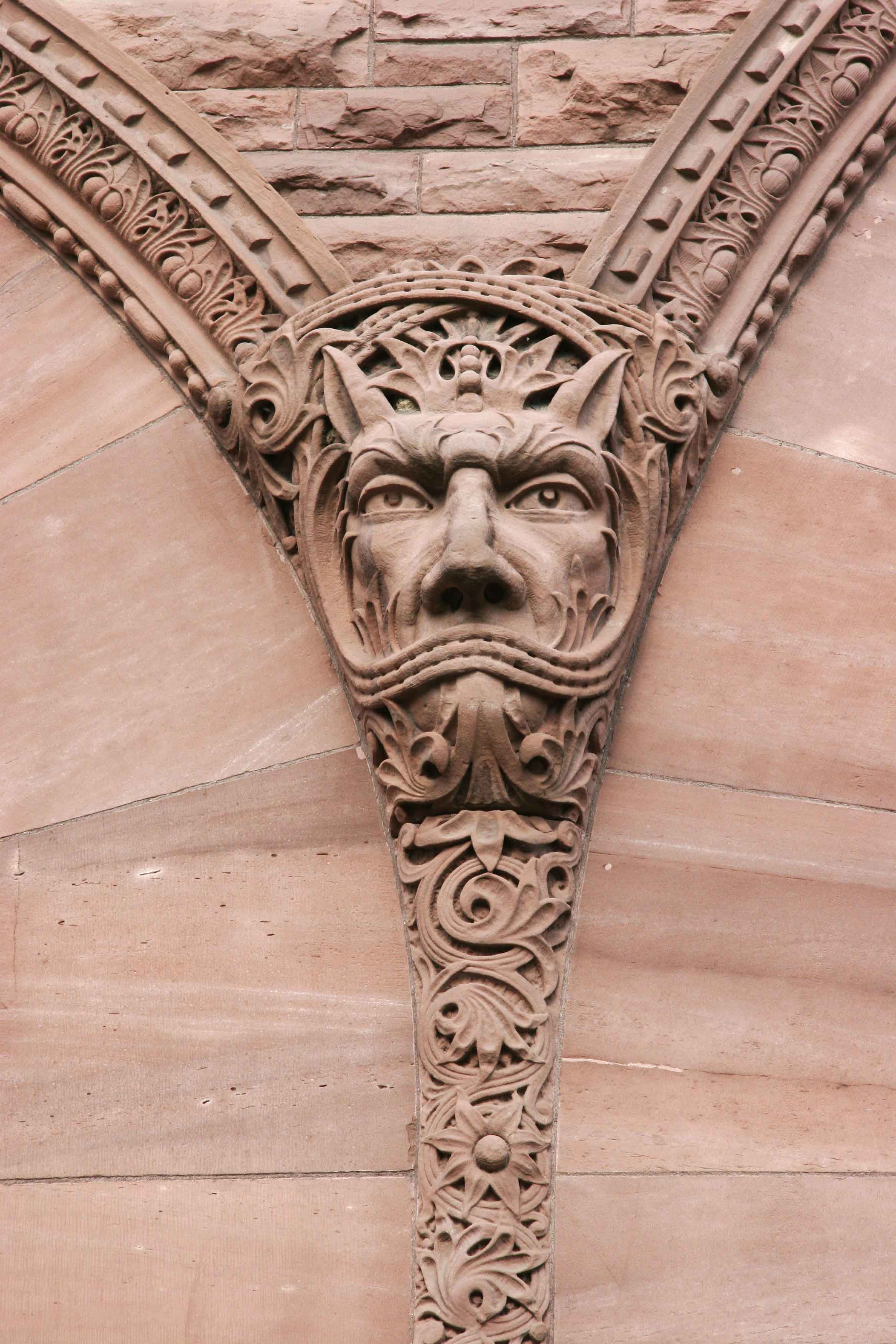 Sandstone carving of a gargoyle-like face on the outside of the Legislative building