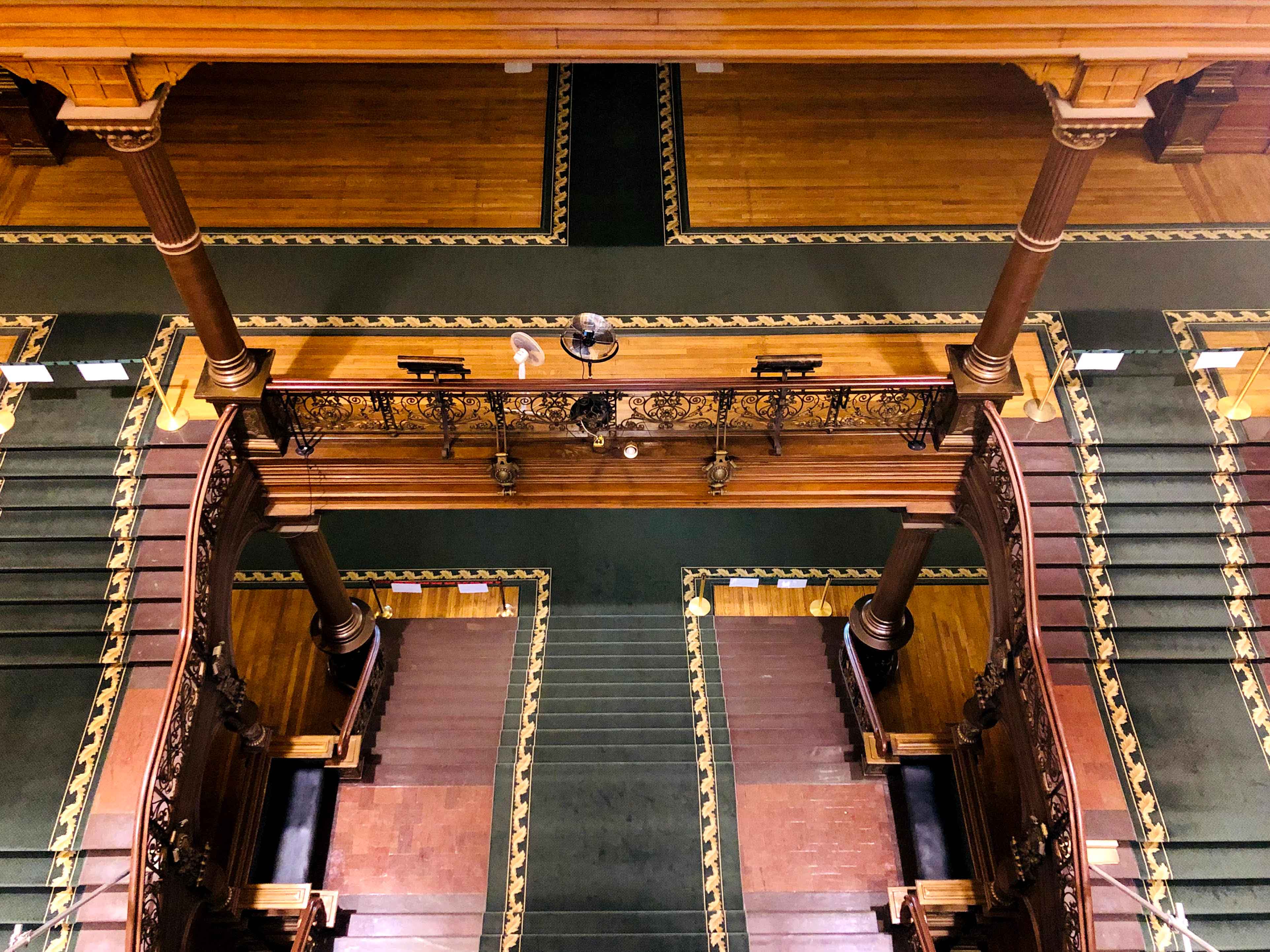 A top down view of the grand staircase showing the two levels, columns, and ironwork.
