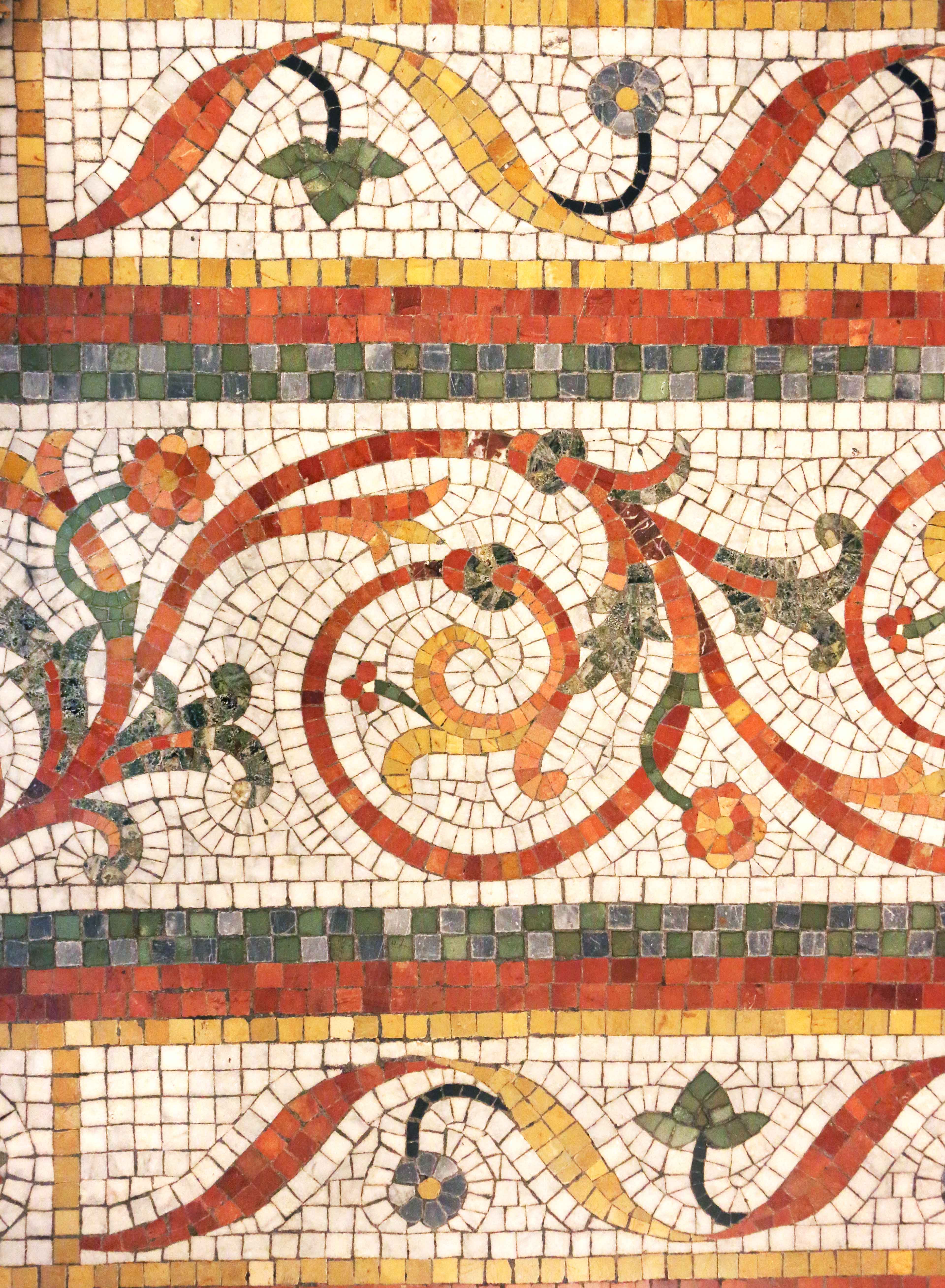 Detailed view of the colourful mosaic floors in the Legislative building's West wing.