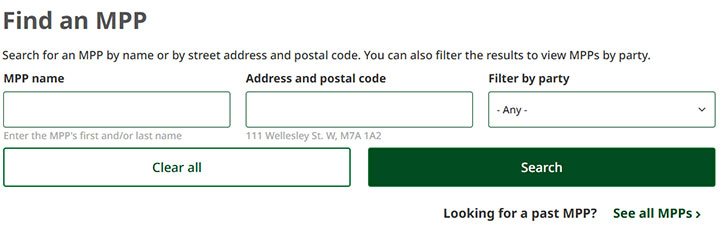 Use the on the Legislative Assembly’s website to find your riding, your MPP’s profile, and their contact information. Enter your address in the search field and select “Search." For the most accurate results, use your full address, including city and postal code.