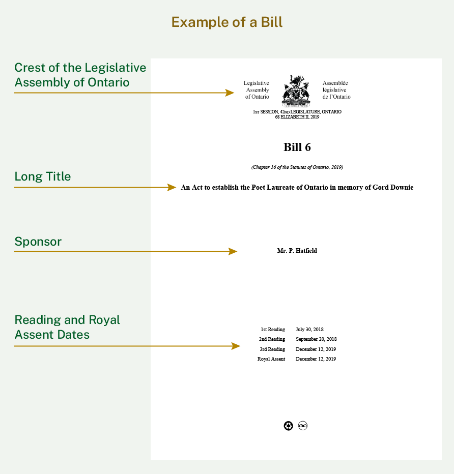 All versions of Ontario bills from 1995 onwards are available on the Legislative Assembly’s website. Pre-1995 bills are available in public and university libraries. Note that the title on the cover page is the “long title”. The short title, or the title most often used to refer to the bill, is provided in its final clause.