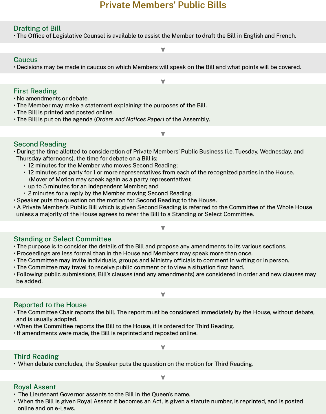A Private Member’s Public Bill is introduced and given First Reading during the Afternoon Routine Proceeding Introduction of Bills. The bill is printed, copies are distributed, and the text is posted on the Assembly’s Internet site.