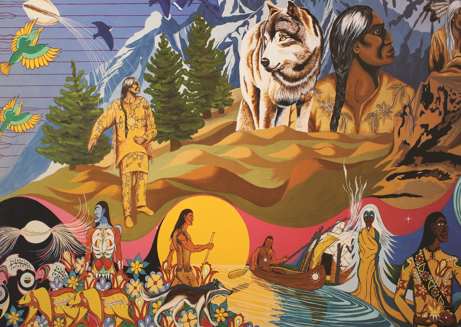 The original mural was painted directly on the walls of the library at the Lloyd S. King Elementary School in the Mississaugas of the Credit First Nation community. It was created collaboratively by Aboriginal artists Philip Cote, Rebecca Baird and Tracey Anthony, with help from aspiring local youth artists.