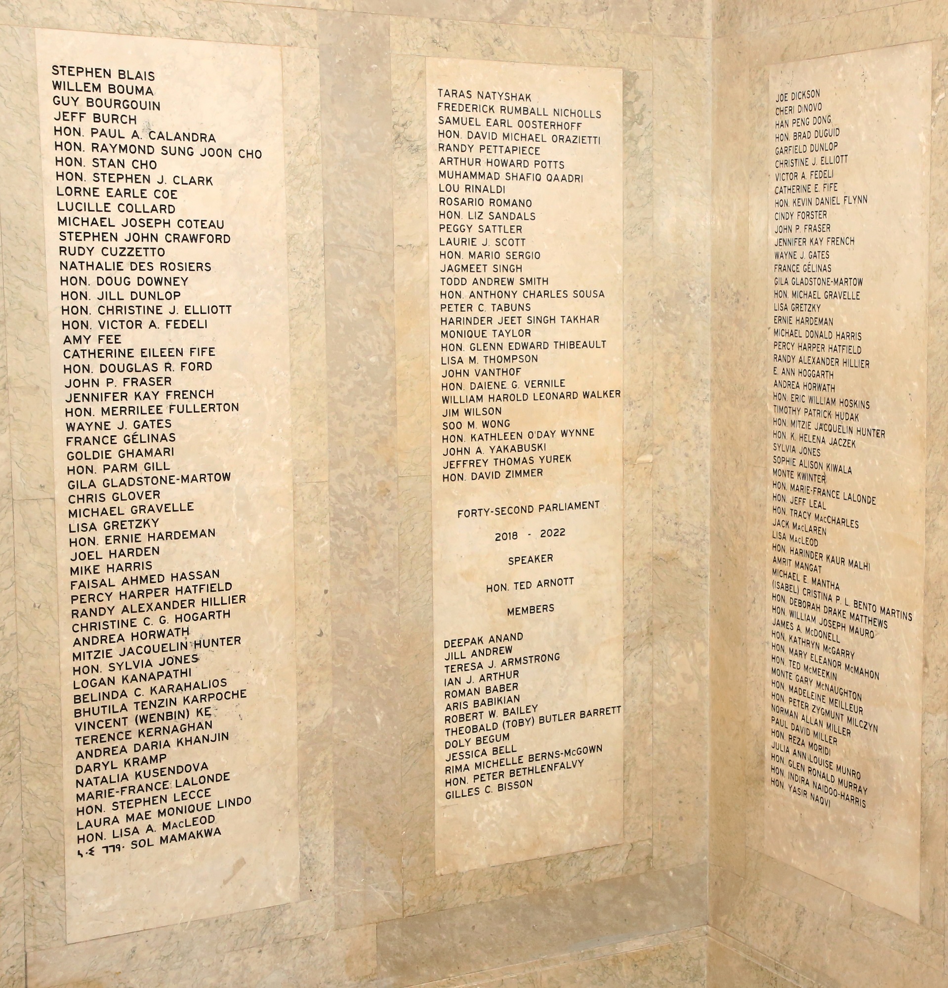 Marble walls near the grand staircase in Ontario's Legislative Building feature the carved names of previous Members of Provincial Parliament.
