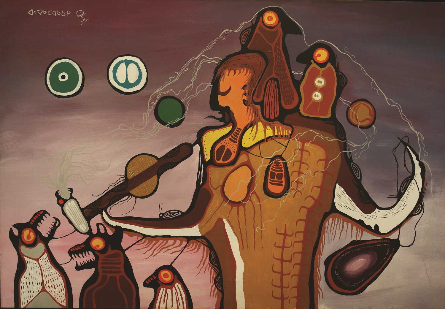 Blake Debassige (b. 1956) is a renowned member of the second generation of Ojibwe artists who practice the Woodland School of Art, popularized by artist Norval Morrisseau. Ojibwe legends feature prominently in his pieces, and Debassige champions many issues through his artwork, such as environmental degradation and Indigenous language preservation.