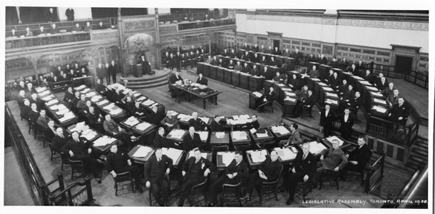 Seating in the Legislative Chamber is arranged into a horseshoe shape during the 1930s. One reason being that it might make it easier for MPPs to hear each other during debates. At the time, it was also becoming a typical seating style in other legislative jurisdictions. The traditional parallel seating arrangement returned in 1944.