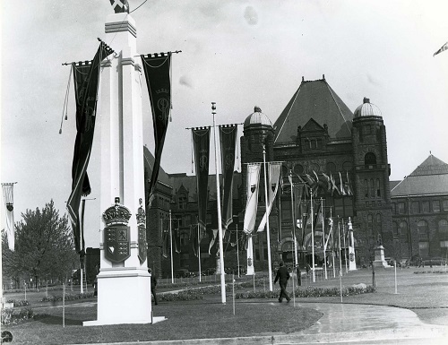 Britain declares war against Germany on August 4th, 1914, with Canada entering the war at the same time in support of its mother nation. A number of Members of Provincial Parliament as well as Ontario provincial government civil servants left work to enter the armed forces and train to go overseas to fight in Europe. Here, an artillery parade takes place in front of the Legislature in 1915.