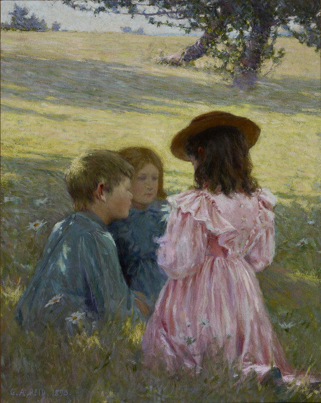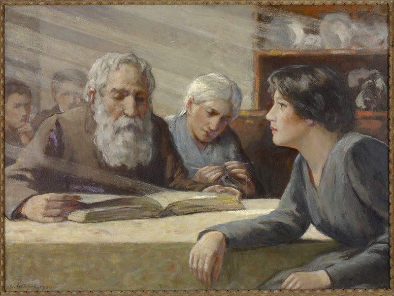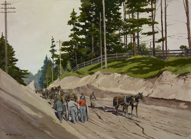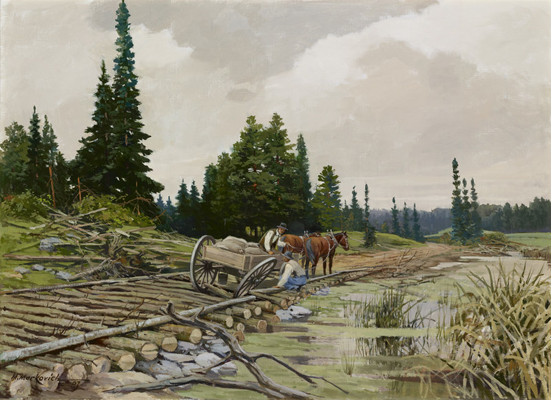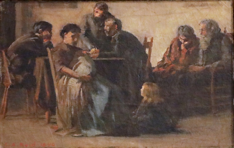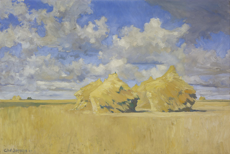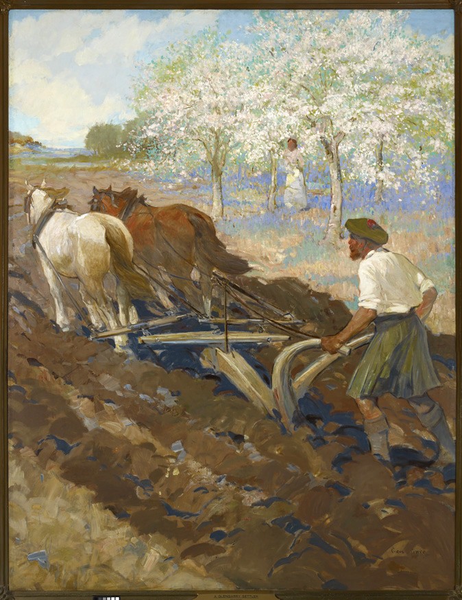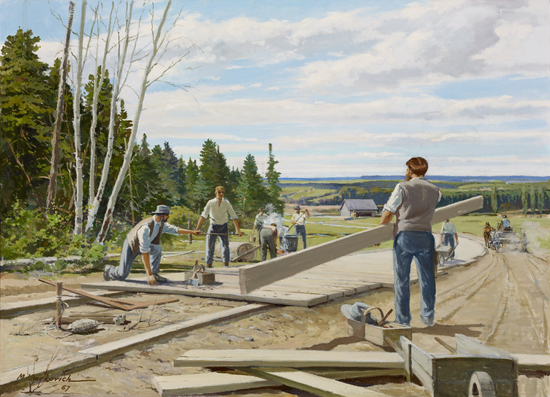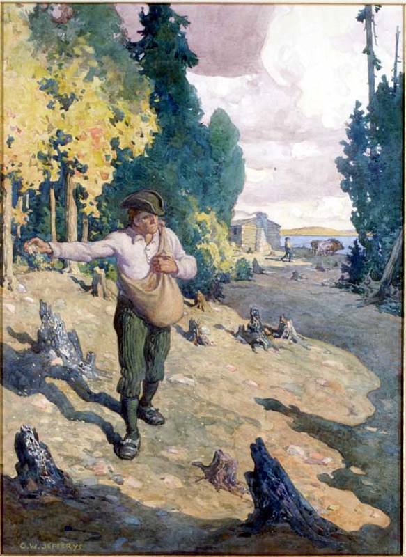 Other works were created by Ontario artists George Agnew Reid and C.W. Jefferys. Reid was a prolific artist who donated 459 pieces to the Ontario government. His pieces often depict rural life and landscapes. Jefferys was a landscape painter and muralist, and is best known for his historical illustrations, which were primarily created for school history textbooks beginning in the 1920s.