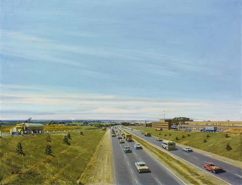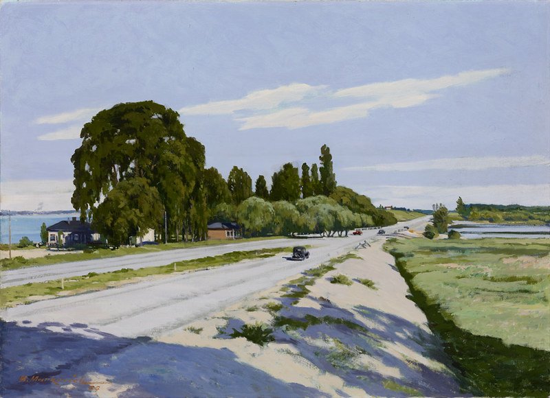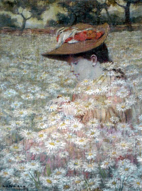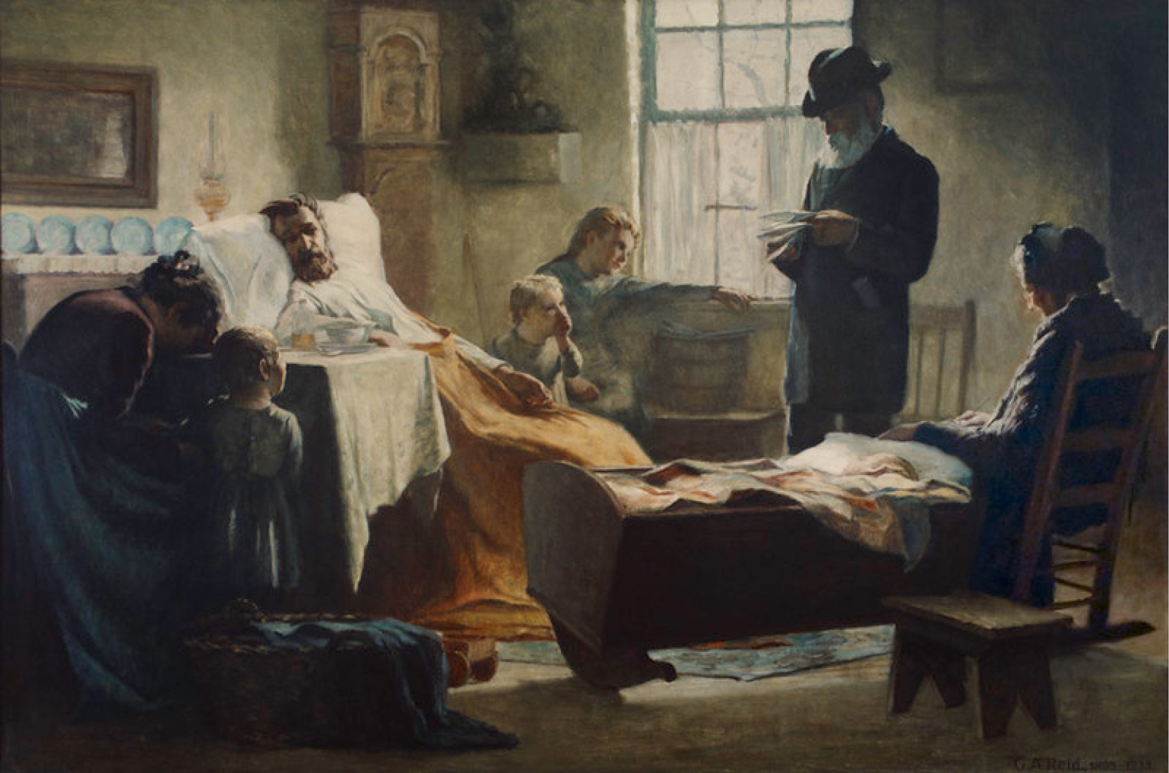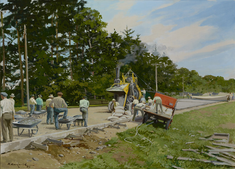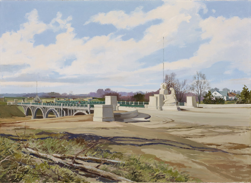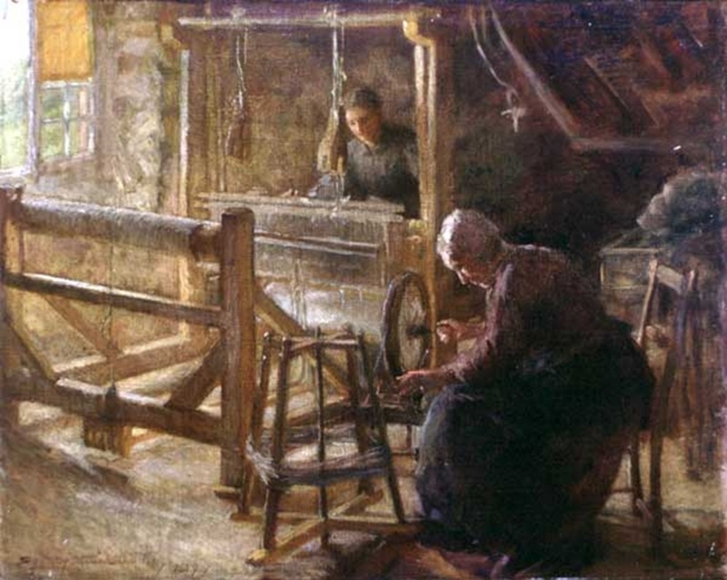 Other works were created by Ontario artists George Agnew Reid and C.W. Jefferys. Reid was a prolific artist who donated 459 pieces to the Ontario government. His pieces often depict rural life and landscapes. Jefferys was a landscape painter and muralist, and is best known for his historical illustrations, which were primarily created for school history textbooks beginning in the 1920s.