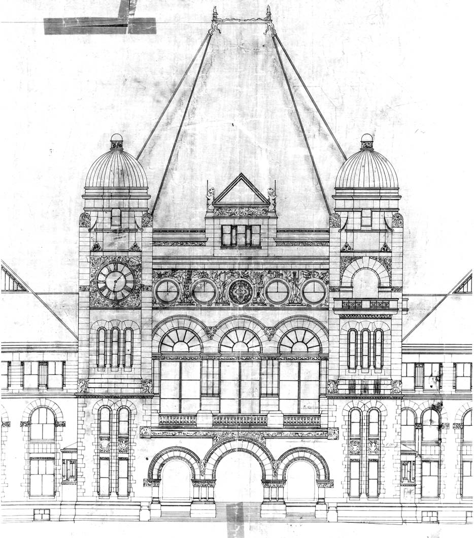 Ontario’s Legislative Building rises above the historic grounds of Queen’s Park in downtown Toronto. It took six years to build from 1886 until 1892, and was officially opened in 1893. It was designed in the Richardson Romanesque style of architecture, which typically features elements from northern Italian structures such as heavy stonework, rounded archways, domed towers, and detailed carvings. The exterior walls were made of pink sandstone quarried from the Credit Valley near Orangeville, Ontario. Large pieces of stone were brought to Queen’s Park and carved on the grounds by English stonecutters. The roof was covered in slate from Vermont, and copper was used over the roof domes.