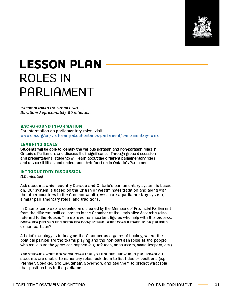 Lesson Plan - Roles in Parliament Click on the following link to view the complete Lesson Plan - Roles in Parliament