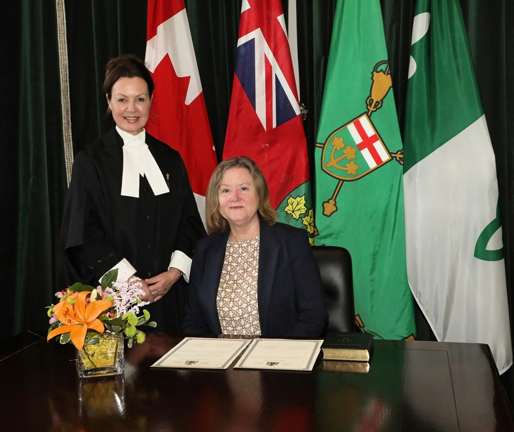 L'honorable Donna Skelly, présidente de l'Assemblée législative de l'Ontario (à gauche), assermente Cathryn Motherwell (à droite), la nouvelle Commissaire à l'intégrité de l'Ontario.