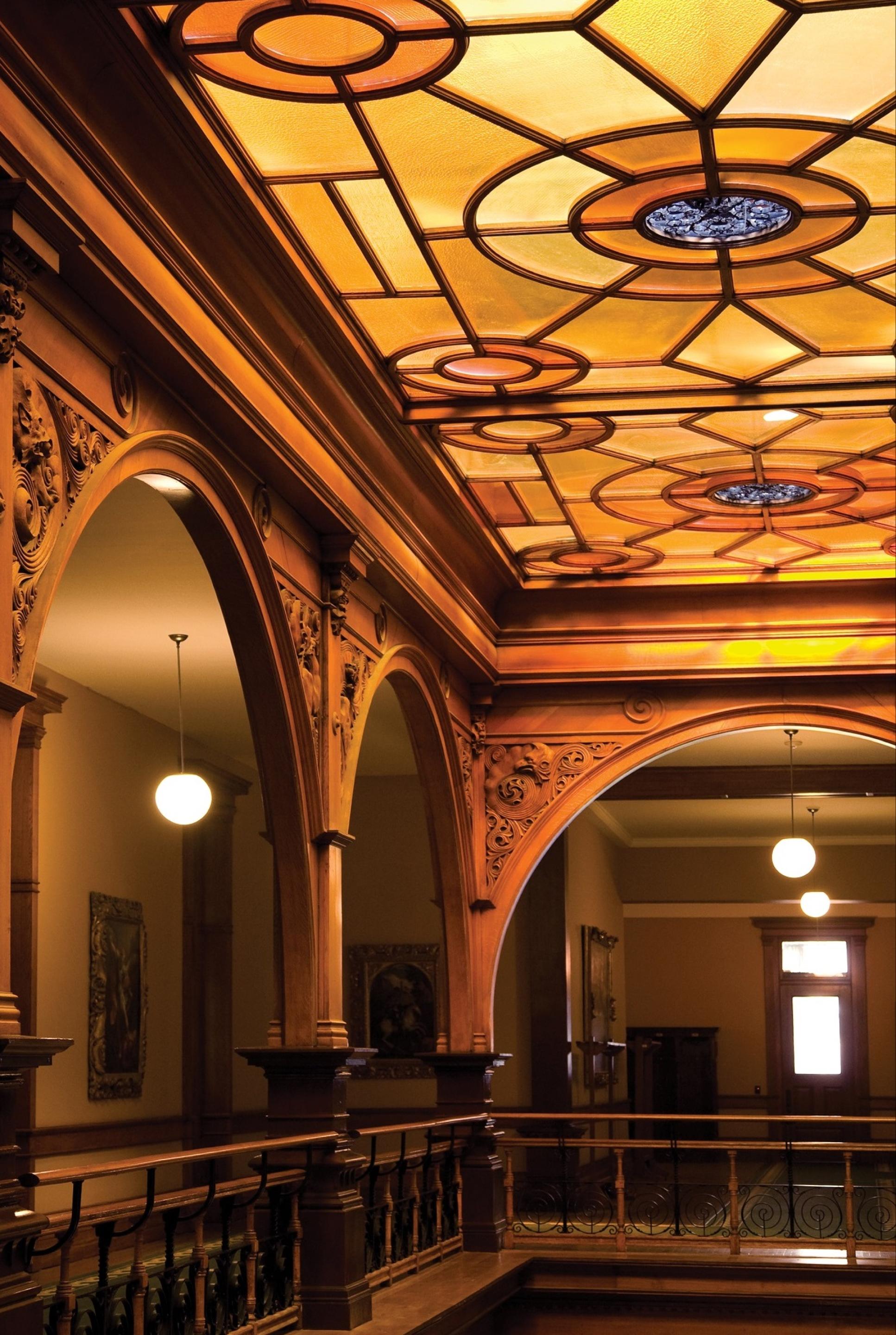 L’aile est de l’édifice de l’Assemblée législative date de 1893 et comporte un plafond en vitrail grâce auquel la lumière naturelle atteint les corridors. Ornements de bois sculptés, que l’on retrouve sur de nombreux piliers. Motifs complexes rappelle les influences médiévales du style roman richardsonien.