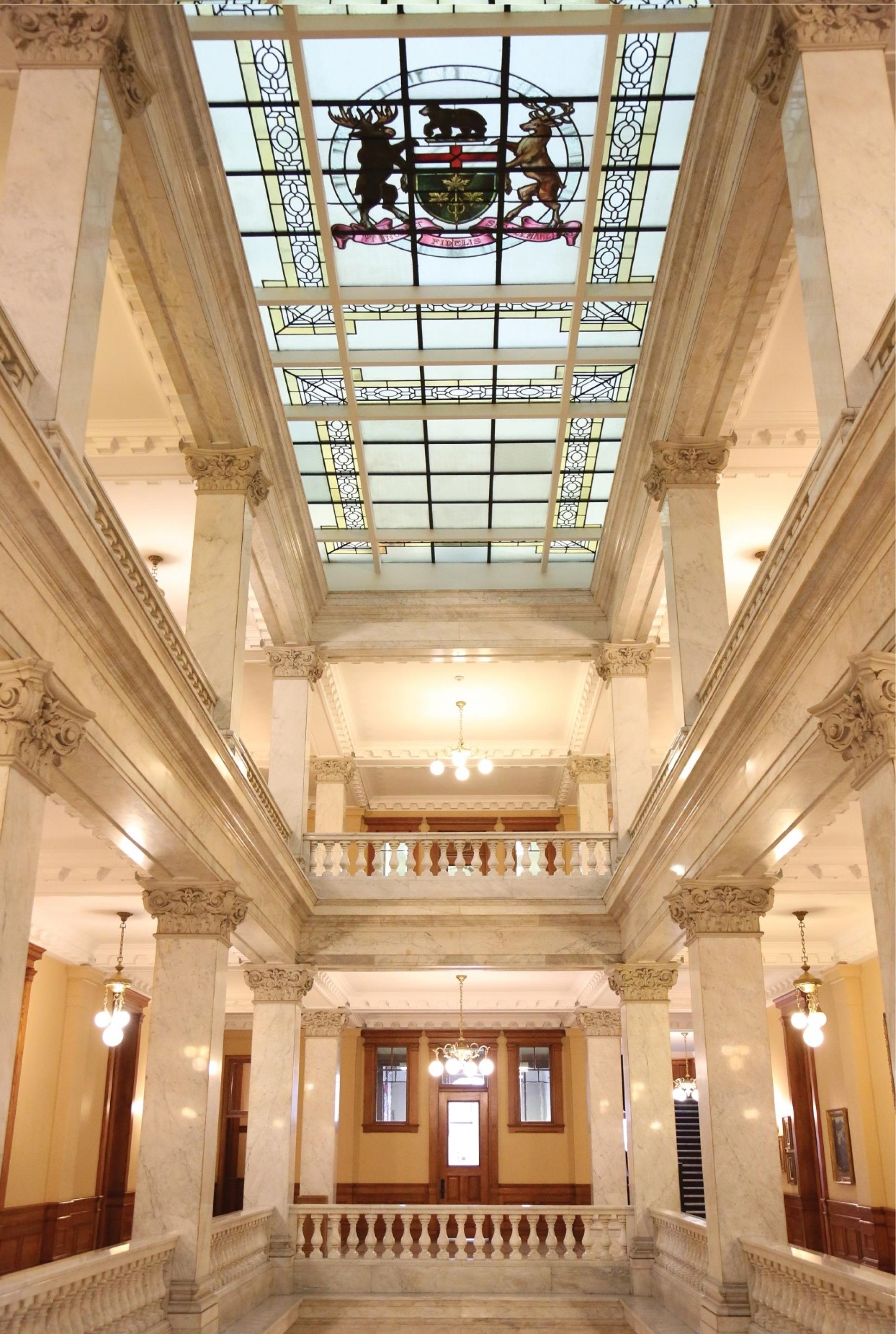 L’aile ouest de l’édifice de l’Assemblée législative a été reconstruite en marbre après l’incendie dévastateur du 1er septembre 1909. L’architecte E. J. Lennox a conservé le style roman richardsonien de l’extérieur de l’aile, mais a choisi un style néo-classique pour l’intérieur. Les armoiries de l’Ontario sont bien visibles dans le plafond de vitraux.