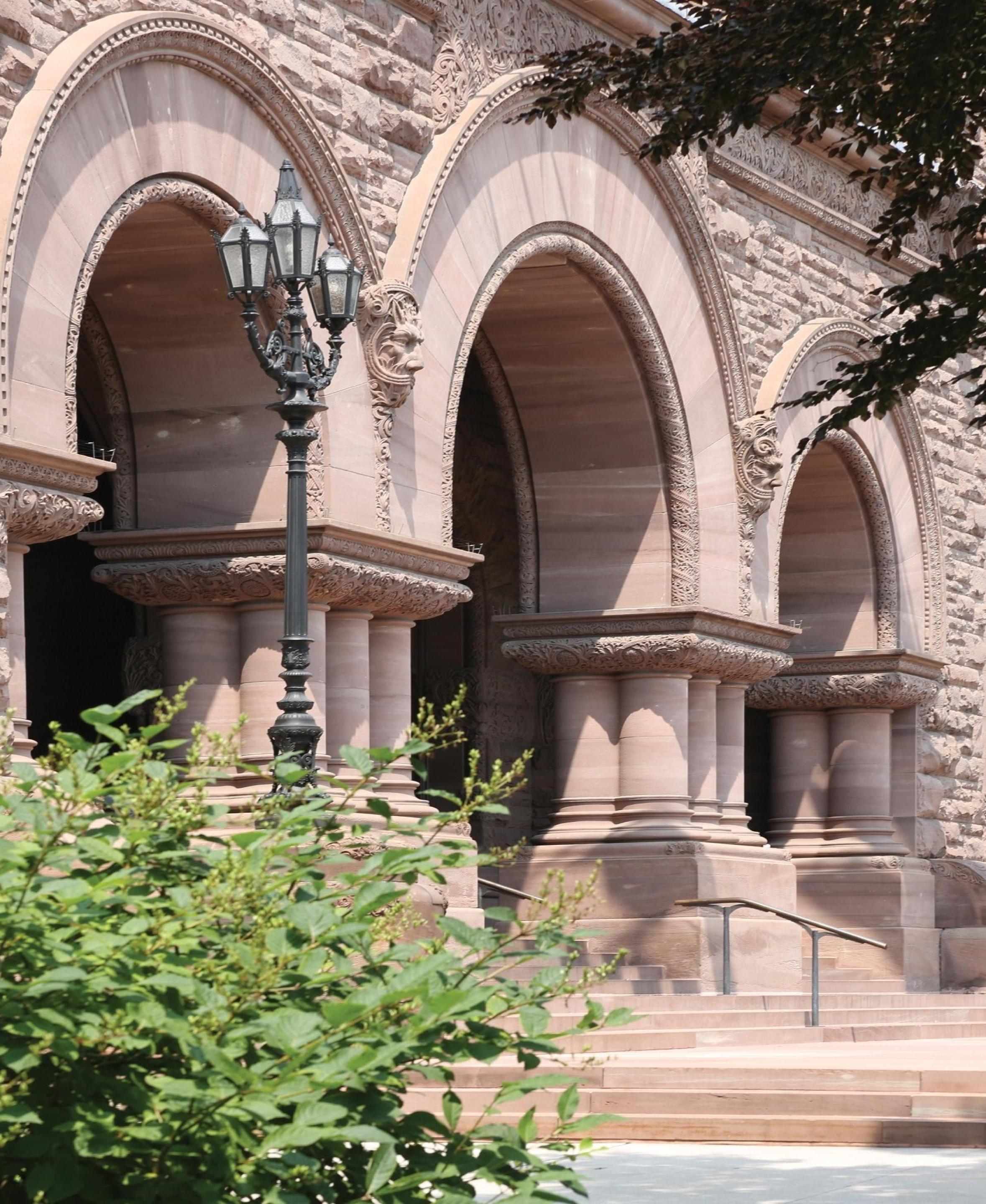 Les arches sont un autre élément typique du style roman richardsonien. Celles-ci, à l’entrée sud de l’édifice de l’Assemblée législative, sont faites de grès rose extrait de la région de Credit Valley, près d’Orangeville, en Ontario.