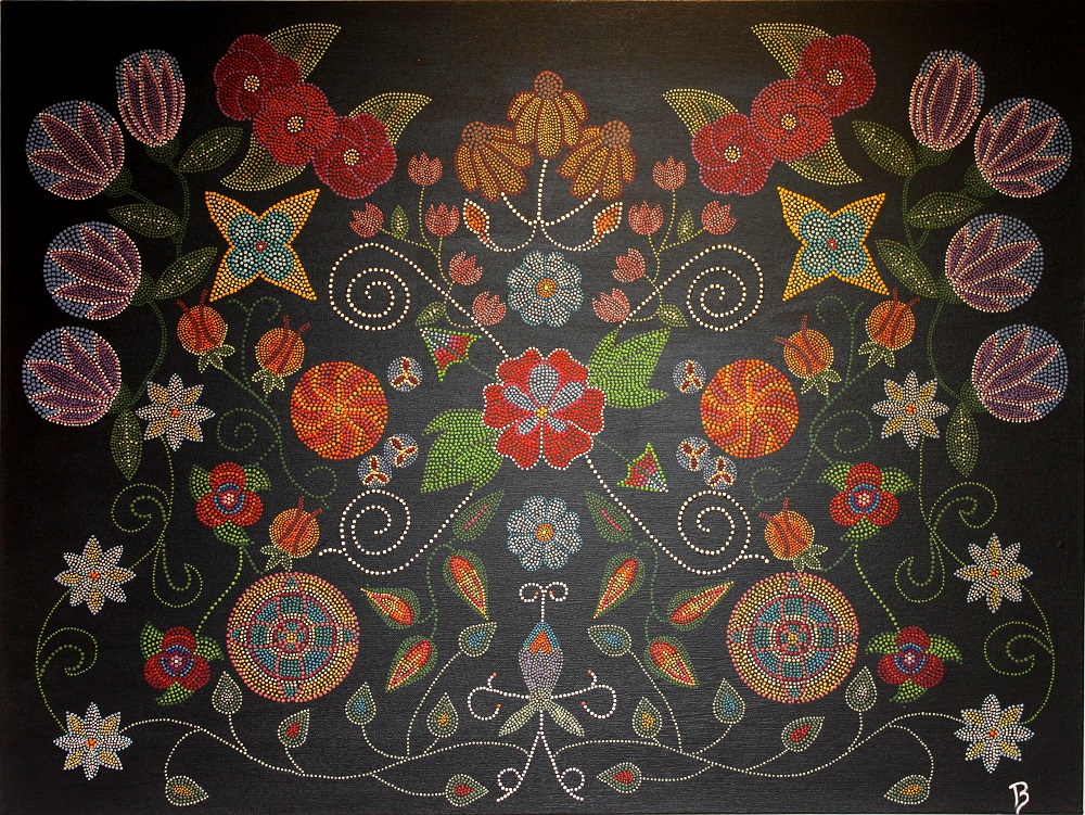 Né à Winnipeg, l’artiste métis Brian Kon vit et travaille à Niagara Falls depuis 1996. Il pratique la peinture par points, ou par perles, une version moderne du perlage traditionnel des Métis. La technique consiste à appliquer des « perles » de peinture individuellement pour former une image. De nombreux motifs figurant dans les œuvres de Brian Kon sont inspirés d’anciens vêtements ou artefacts de son peuple.