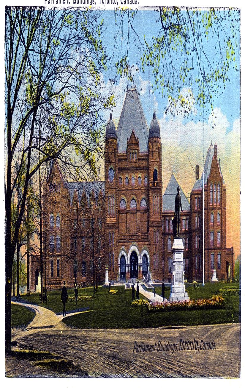 On aperçoit la statue de Sir John A. Macdonald au premier plan. Cartes postales anciennes de l’Assemblée législative