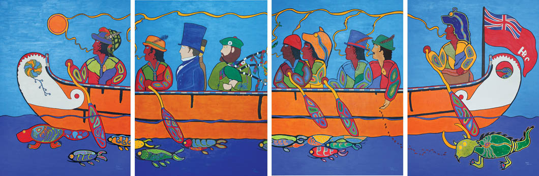 L’oeuvre George Simpson’s Canoe Brigade met en scène sir George Simpson, gouverneur de la Compagnie de la Baie d’Hudson en Terre de Rupert, assis dans son canot en compagnie des experts pagayeurs iroquois de Caughanawaga qu’il a triés sur le volet, de voyageurs canadiens-français et de son joueur de cornemuse personnel. Devant le gouverneur se trouve son commis, Robert Miles. Les membres de l’équipage rament au rythme de la chanson traditionnelle française À la claire fontaine, qu’ils chantent en choeur. Pendant ses quarante années de service au sein de la Compagnie de la Baie d’Hudson (de 1820 à 1860), George Simpson a exploré la majorité du territoire qui deviendrait le Canada, visitant de nombreux postes de traite de fourrure éloignés sous sa gouverne et s’aventurant dans des régions jusque-là inexplorées.