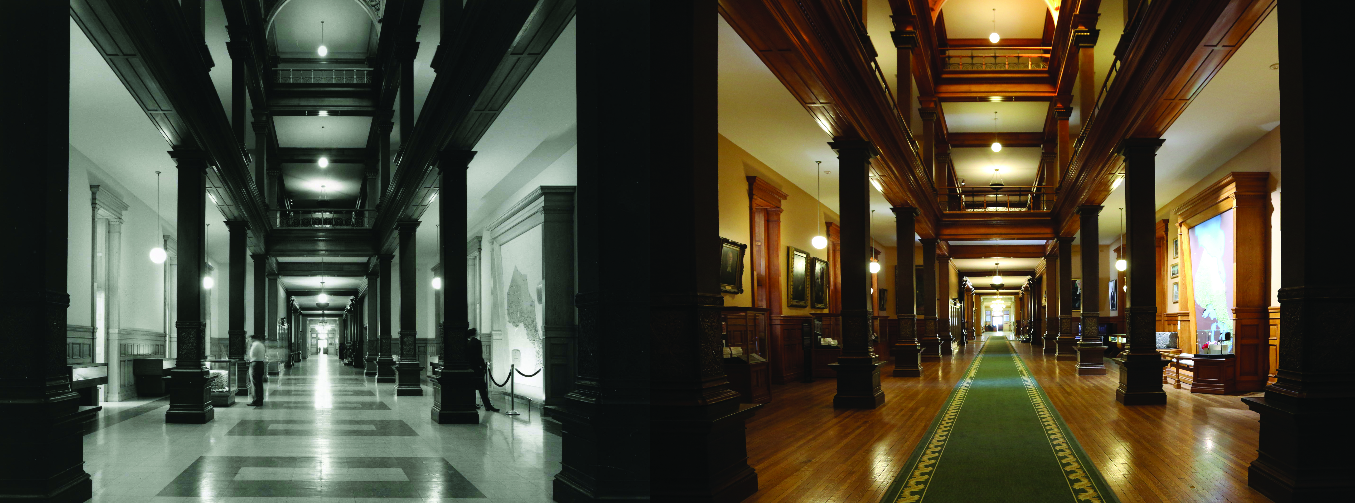 La carte de l’Ontario a été installée en 1967; depuis, la carte et la section qui l’entoure ont été mises à jour. Par exemple, le minerai de nickel est passé du côté sud de la salle à son côté nord. Vous constaterez aussi que des portraits des présidents ornent les murs dans la photo de 2015.