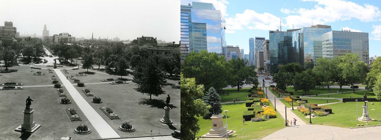 Sur la photo datant du début des années 1930, on remarque l’absence des lampadaires qui bordent aujourd’hui le chemin entre l’édifice et la statue de Sir John A. Macdonald. Toutefois, on aperçoit au loin l’architecture Beaux-Arts de l’édifice Canada Life situé à l’intersection de l’avenue University et de la rue Queen. Construit entre 1929 et 1931, il est aujourd’hui caché derrière des édifices plus élevés.