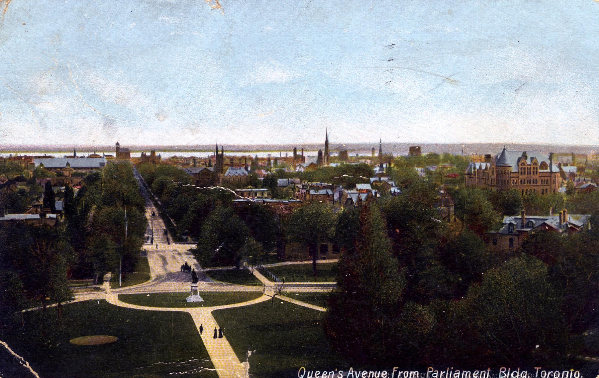 Vue aérienne de Toronto regardant vers le sud de l’édifice législatif, vers 1905.