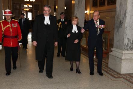 Le duc d'Édimbourg promène l'aile ouest de l'édifice législatif de l'Ontario accompagner du président Dave Levac (gauche) et la greffière Deborah Deller (centre) pendant la visite royale de 2013.