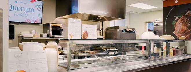 Le Café Quorum propose un menu varié pour le déjeuner et le dîner dans une ambiance de cafétéria. Que vous cherchiez quelque chose à grignoter ou à emporter ou encore un repas complet, vous y trouverez certainement de quoi satisfaire votre envie.